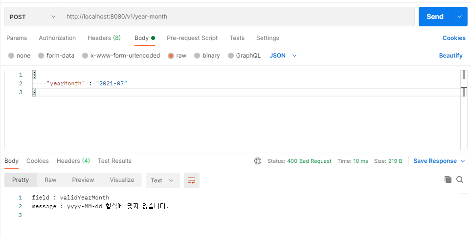 postman์ ์ด์ฉํด์ ํ ์คํธ๋ฅผ ํด๋ณด๋ฉด validation์ด ์ ์ ์ฉ๋๋ ๊ฒ์ ํ์ธํ ์ ์๋ค์!